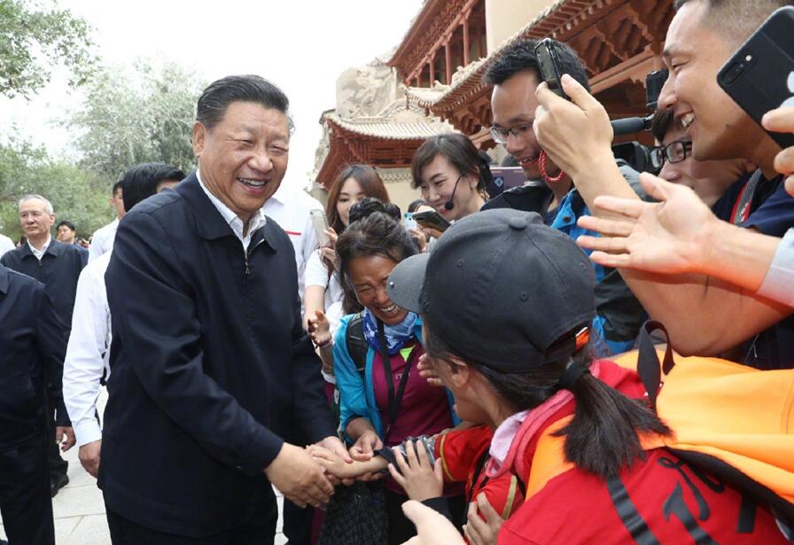 习近平步行察看景区整体风貌,沿途听取莫高窟基本情况介绍,走进洞窟实地察看历史悠久的彩塑、壁画。看到总书记来了,正在这里参观游览的群众激动地欢呼起来,纷纷向总书记问好。习近平主动走上前去,同他们热情握手,互致问候,并向远处的游客挥手致意。一位带着孩子自驾出行的游客大声告诉总书记,他们从南通出发,已经走了四天了。总书记招手笑道:“一路上可以看看,孩子们可以长见识。”