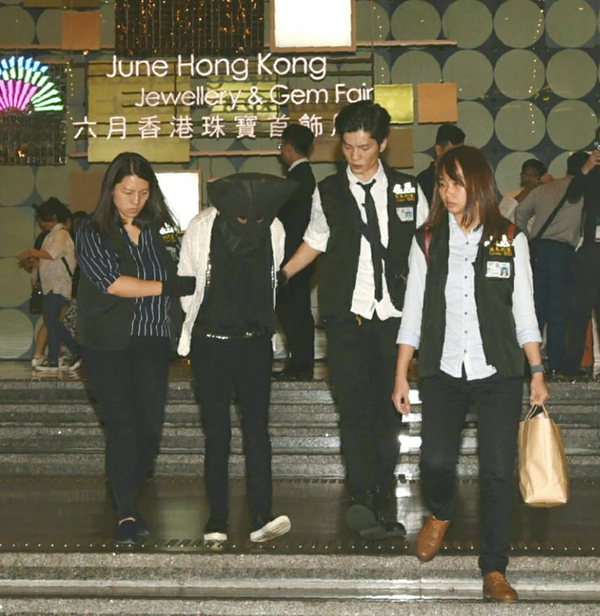 被告范麗萍(左二)偷換寶石被警方拘捕。(資料圖片)