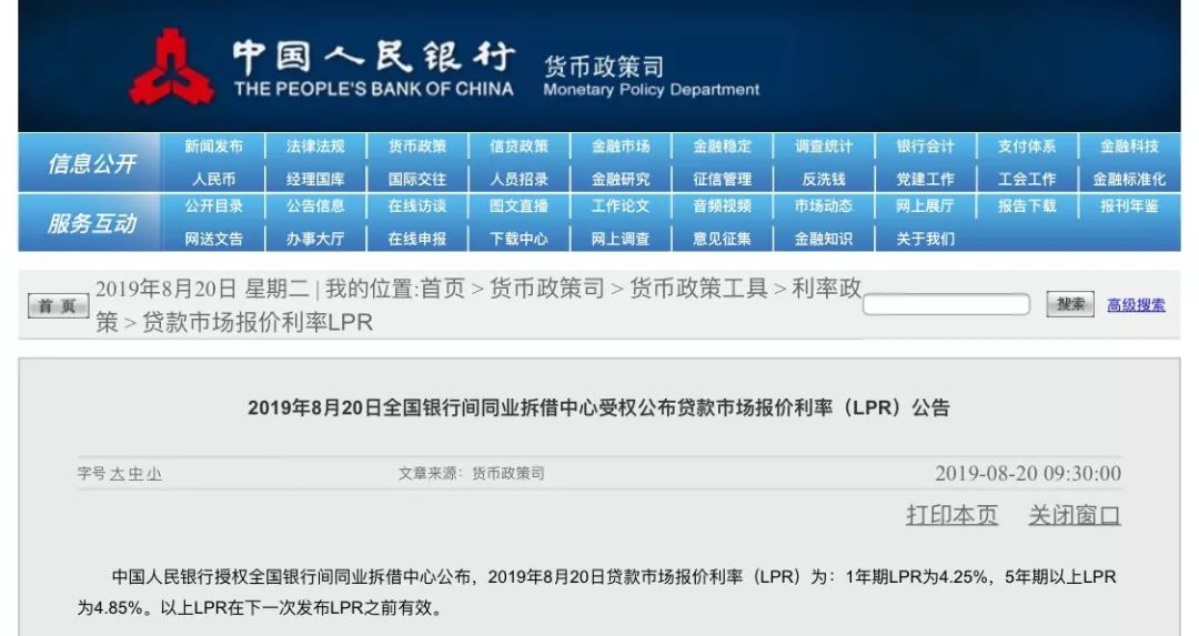 8月20日,貸款市場報價利率(LPR)形成機制改革後的首次報價誕生。9:30分左右,中國貨幣網公布新LPR首次報價結果,1年期LPR報價4.25%,5年期LPR為4.85%。