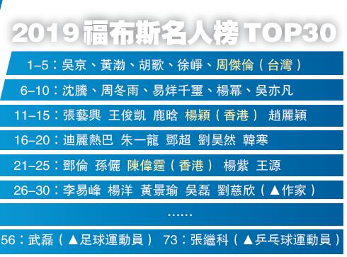 榜單首位香港藝人為楊穎(anglebaby,位列14名),楊穎雖無出色的代表作,但因外貌出眾被觀眾熟知,福布斯給出的評語為:「手握多個代言,帶貨能力不可小覷。」隨後排名為演員陳偉霆、偶像王嘉爾、演員古天樂、郭富城等。