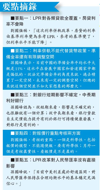在全球央行紛紛實施寬鬆貨幣政策之時,中國會否跟隨降息一直牽動人心。此次LPR利率市場化改革,亦被市場解讀為開啟中國式降息節奏。對此劉國強昨日表示,利率市場化改革就像「修水渠」,目的是讓水流更加暢通,讓水更有效率、更精準地流到田間地頭,但水的大小還是要看閘門。因此,利率市場化改革有利於增強貨幣政策的效果,但不能替代貨幣政策,也不能替代其他政策。