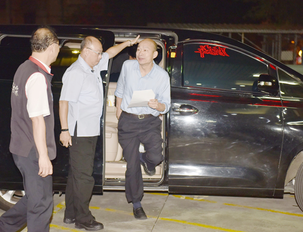 韓國瑜(右)稱,獲情報系統友人警示,其行程遭嚴密監控。中央社