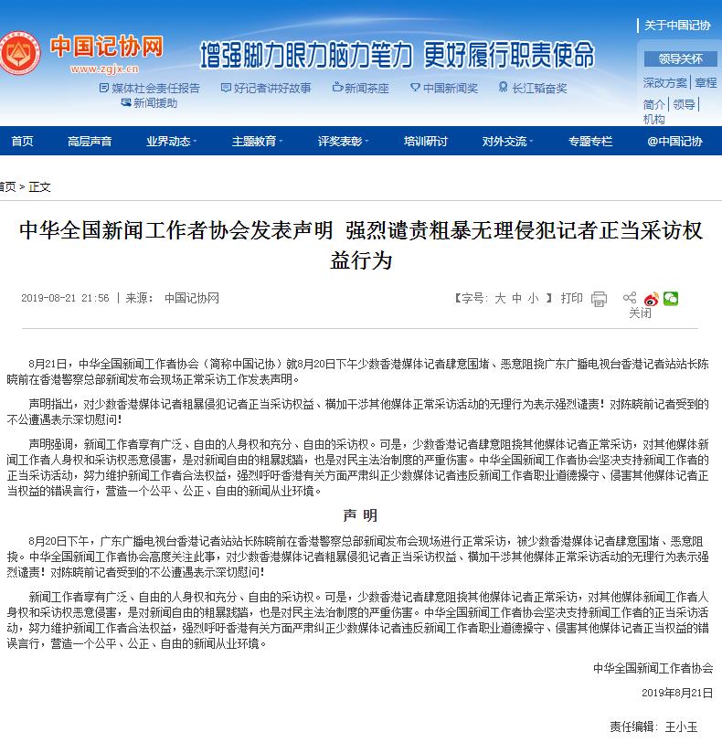 8月21日,中华全国新闻工作者协会(简称中国记协)就8月20日下午少数香港媒体记者肆意围堵、恶意阻挠广东广播电视台香港记者站站长陈晓前在香港警察总部新闻发布会现场正常采访工作发表声明。