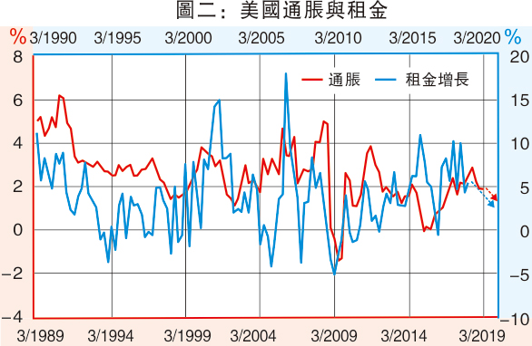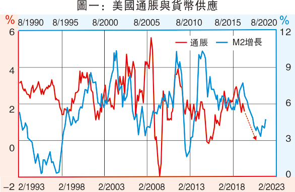 由於長息反映通脹前景,因此今文從推測通脹前景來觀察長息未來走勢。最直接先看貨幣供應。圖一顯示,美國廣義貨幣供應增長領先通脹兩年半,前者自2016年開始回落,雖然近月反彈但仍在近5年的低位,按紅箭預示,料美國通脹在未來兩年多有明顯下行壓力。