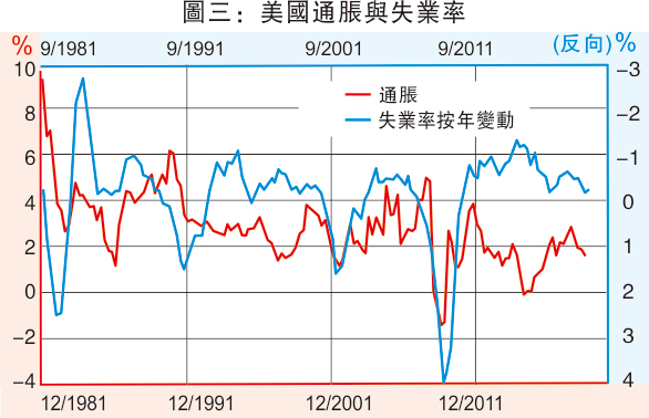 另外可參考菲臘普斯曲線,按理論通脹與失業率呈反比,而圖三顯示,美國失業率按年變動與通脹呈反比,前者領先後者約一季。目前美國已經處於全民就業,初步估計失業率下行空間有限。然而再參考美國零售銷售增長在近5年平均值徘徊,非農職位按年增長回落等,其實失業率反而在短期內很有可能回升。由此推斷,美國通脹沒有明顯上升壓力。