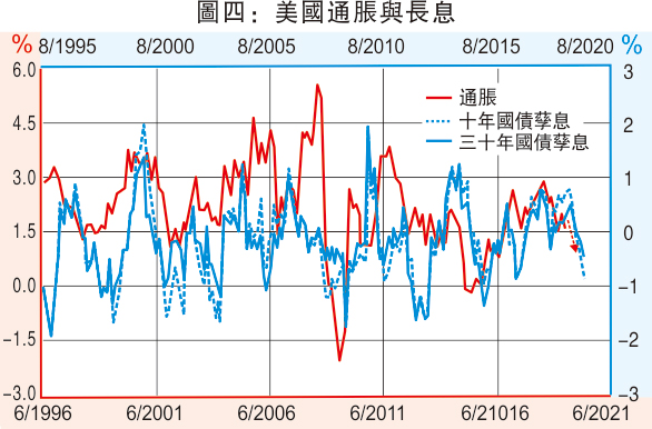 最後,把通脹對上美國長息數據得出圖四,可見其實長息(如十年及三十年國債孳息)領先通脹10個月,而其走勢自去年第四季開始回落。按紅箭預示,通脹將繼續下行,結果與上述三圖得出的結論一致。再重看圖一,貨幣供應增長可預示兩年半後的通脹,那麼對上圖四,其實也可推測長息應至少在2022前繼續反覆下行。綜合可見,美國長息跌勢中線難止,債市今年內仍受投資者歡迎。