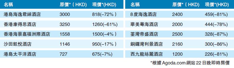 而網上預訂酒店價格較直接入住更低。昨天,港島和九龍區多間酒店最低入住價格在酒店預訂網站顯示,均在200至400元一晚不等。例如,華美達海景酒店為228元;華麗銅鑼灣酒店為285元;華美粵海酒店為307元;荃灣絲麗酒店為270元;西九龍絲麗酒店為224元,等等。