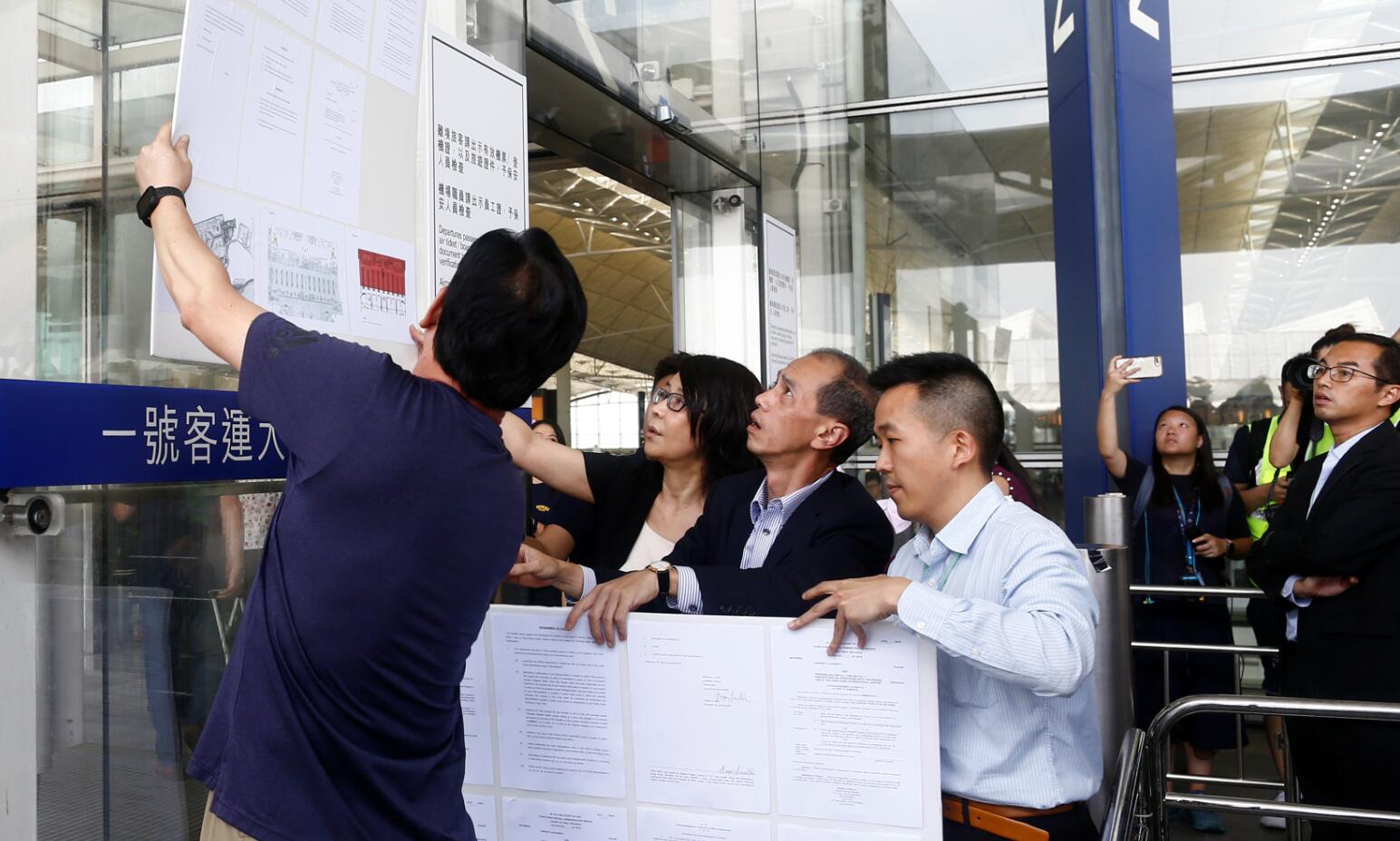 機管局正就機場臨時禁制令申請延期。圖為本月14日,法庭執達吏在機場1號客運大樓門口張貼法庭頒布的 禁制令。
