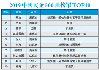 中華全國工商業聯合會發布了 「2019中國民營企業500強」 榜單 及《2019中國民營企業500強調研 分析報告》。華為年營業收入 突破7000億元人民幣,蟬聯民 營企業 500 強榜首、民營企業 製造業500強榜首。 中新社