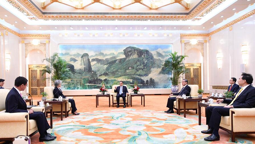 8月22日,国务院总理李克强在北京人民大会堂会见来华出席中日韩外长会的韩国外长康京和、日本外相河野太郎。 新华社记者 申宏 摄