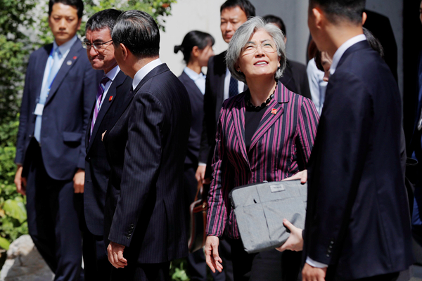 韓國外交部長康京和(右二)與日本外相河野太郎(左二)在近日舉行的第九次中日韓外長會期間,曾就日本對韓出口管制等問題舉行會談,但雙方分歧未解。