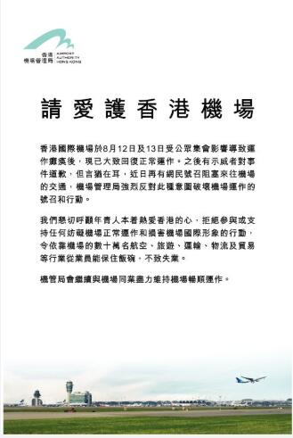 機管局懇切呼籲年青人本著熱愛香港的心,拒絕參與或支持任何妨礙機場正常運作和損害機場國際形象的行動,令依靠機場的數十萬名航空、旅遊、運輸、物流及貿易等行業從業員能保住飯碗,不致失業。