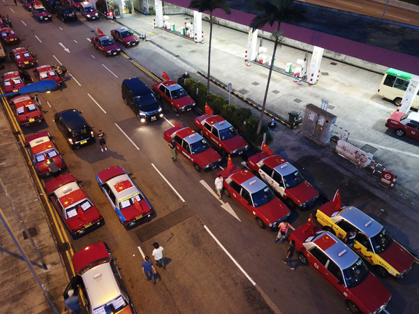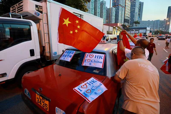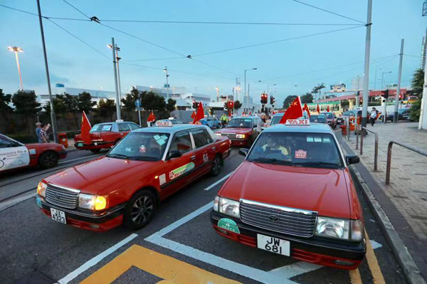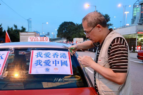 【香港商報網訊】「守護香港大聯盟」聯同香港的士司機從業員總會在今天(23日)發起「守護香港風雨同舟」大行動,超過500輛的士掛上國旗,貼上海報,從港島筲箕灣、尖沙咀出發,圍繞港島區、尖沙咀去觀塘、尖沙咀去荃湾的主要道路行駛,向廣大市民和遊客展示香港熱情好客的風範,用愛心來呼籲全社會要反對暴力,回歸法治,恢復正常秩序。