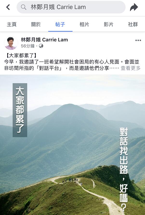 【香港商报网讯】行政长官林郑月娥昨早邀请一班希望解开社会困局的有心人在礼宾府见面。林郑月娥昨日下午在社交网站Facebook发表「大家都累了」的帖文表示,会面并非坊间所指的「对话平台」,而是邀请他们分享对搭建对话平台的想法,并十分感谢他们愿意在困难的时候,走进礼宾府,帮助我们为社会找出路。她说,在呼吁停止暴力的同时,也必须为解开社会更深层次的「死结」提供出路,并帖图呼吁「大家都累了 对话找出路,好吗?」