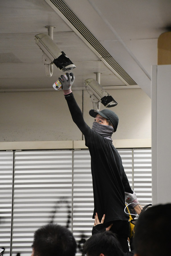 黑衣人噴黑九龍灣站的CCTV鏡頭。