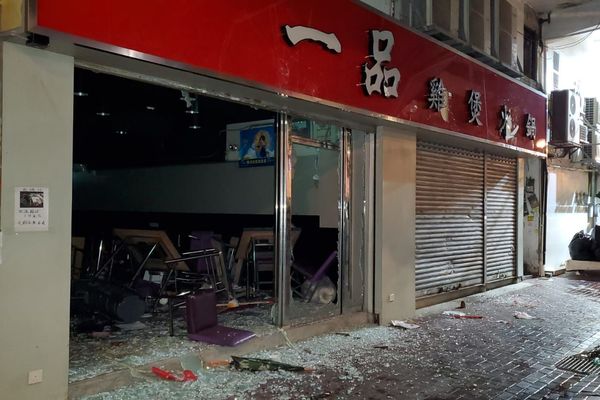 【香港商报网讯】示威者25日举行“荃葵青反修例游行”,随后演變成激烈警民衝突。在荃湾一带,激进示威者向警方投掷自制汽油弹,警方出示黑旗、橙旗警告后,示威者继续投掷硬物,警方被迫发射催泪弹。并首次将水炮车布署在驱散示威者的行动中。此外,多家店铺被打破玻璃。而在被暴徒追打、围攻期间,有警察疑似不得已鸣枪示警,欲逼退示威者。