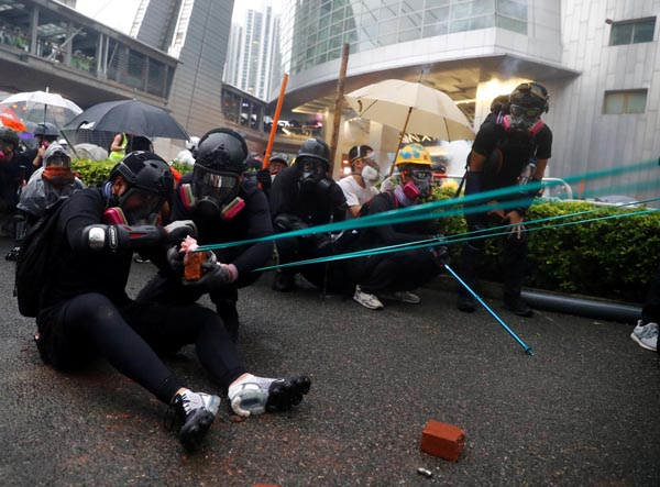 暴徒用橡筋繩發射磚塊襲擊警員。