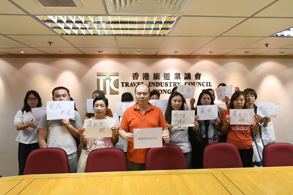 香港導遊總工會多名導遊被無良旅行社拖糧,到香港旅遊業議會求助。 記者 崔俊良攝