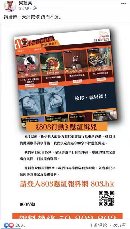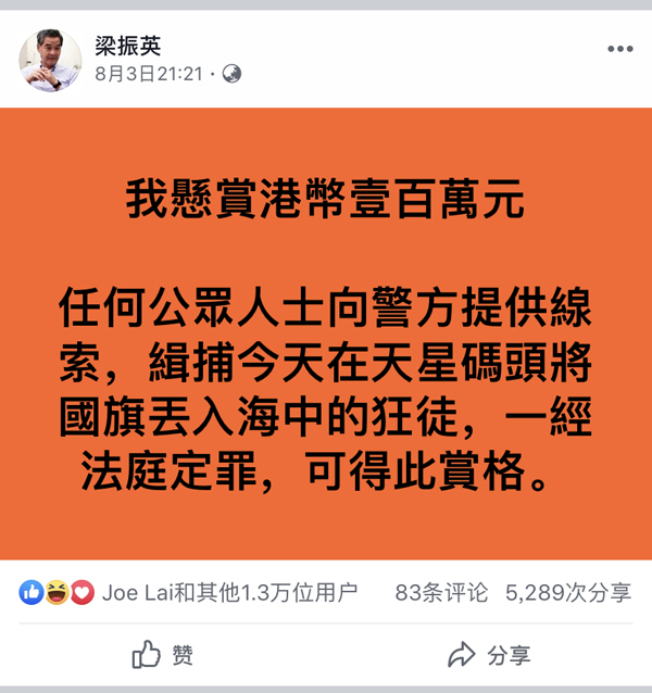 【香港商報網訊】8月3日傍晚,蒙面黑衣暴徒扯下海港城前旗杆上的五星紅旗,並扔入海中,引起香港和海內外各界強烈憤慨。當晚,全國政協副主席、香港特別行政區前行政長官梁振英在個人社交網站首發懸賞令,懸賞100萬港幣,徵集丟國旗入海狂徒的線索。8月27日,梁振英同時向傳媒記者和其個人社交網站發佈803懸紅爆料網,803.hk,懸紅緝拿過去兩個多月犯事的暴徒和狂徒線索。