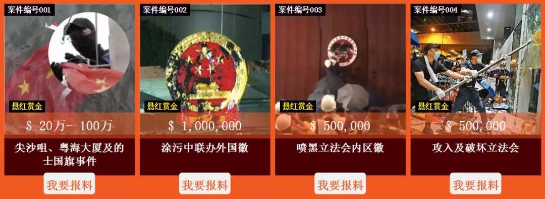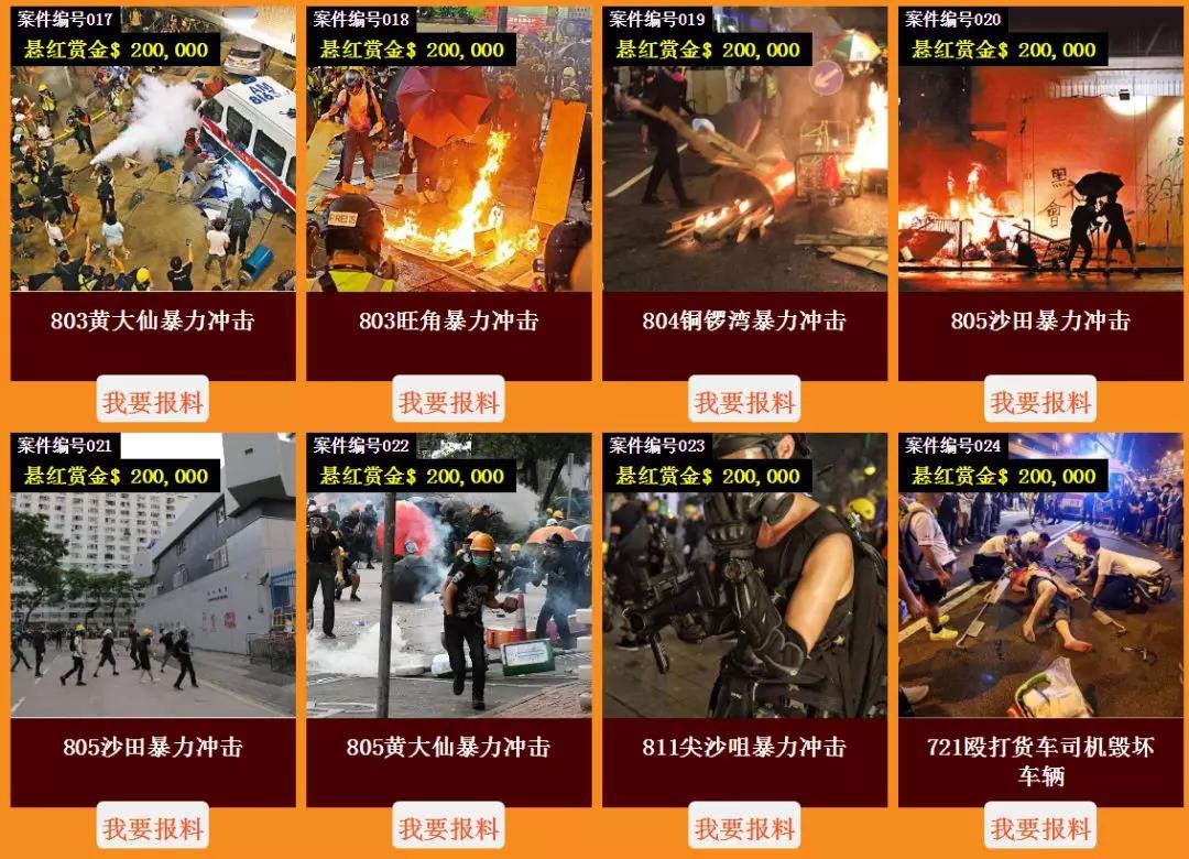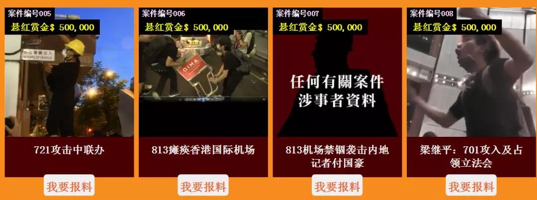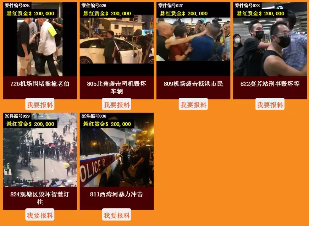 這個名為《803行動》的懸紅緝凶網站,已經公佈迄今30宗暴徒案件的懸紅賞金,每個案件有編號,懸紅金額在20萬至100萬港幣不等,除了尖沙咀扔國旗暴徒線索的懸紅金額高達100萬港幣,塗汙中聯辦外國徽暴徒線索的懸紅賞金亦高達100萬港幣。另外,除反政府示威者的暴行外,網站懸賞的罪案還包括“721元朗白衣襲擊市民”及“811尖沙咀傷眼事件”,兩宗個案的懸賞額都達到40萬港幣。知道線索的爆料者只需點擊每個案件下方的“我要爆料”,或者直接撥打爆料熱線(852)59803803即可爆料。