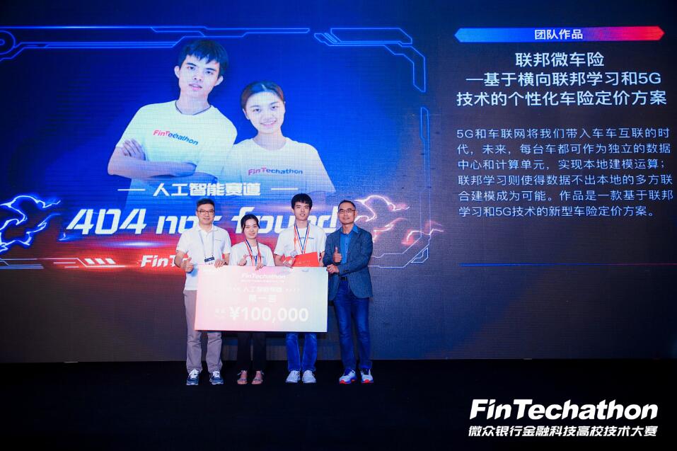 經過層層選拔,人工智能與區塊鏈賽道各有十支隊伍入圍決賽。在長達30個小時的馬拉松式編程后,雙賽道冠軍終于誕生。人工智能賽道冠軍是“404 not found團隊”,成員來自北京大學和加州大學圣地亞哥分校,獲獎作品《聯邦微車險》基于聯邦學習和5G技術,收集用戶的駕駛習慣數據,建立車險模型,創建新型的車險定價方案;區塊鏈賽道冠軍是“紫荊路Tank團”,成員來自華南師范大學,獲獎作品《排污權許可區塊鏈交易平臺》,旨在通過區塊鏈輔助排污政策制定,共建污水治理生態循環。