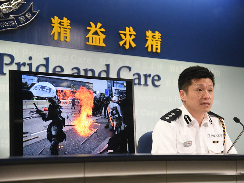 警方例行記者會上播放暴徒向防暴隊列陣掟汽油彈片段,火光熊熊。 記者 蔡啟文攝