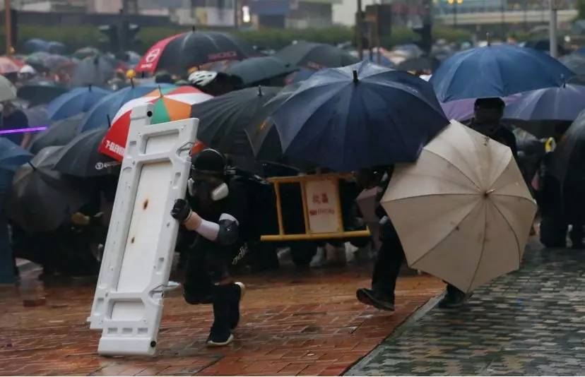 在遊行期間,一些示威者會在警察趕來前拆掉路邊的護欄紮成三角陣,或搬運一切可以拆卸的市政設施封堵道路。與警方對峙時,他們會撐起雨傘或遊泳浮板,並且不斷挑釁。《環球時報》記者發現,幾乎每處示威現場都有一些蒙面人在不斷高聲呼喊,同時指揮圍攻引起其懷疑的路人。在己方力量占優時,“勇武派”往往會更加囂張,他們會向警察投擲磚頭、鐵棍等物,甚至圍攻落單的警察。
