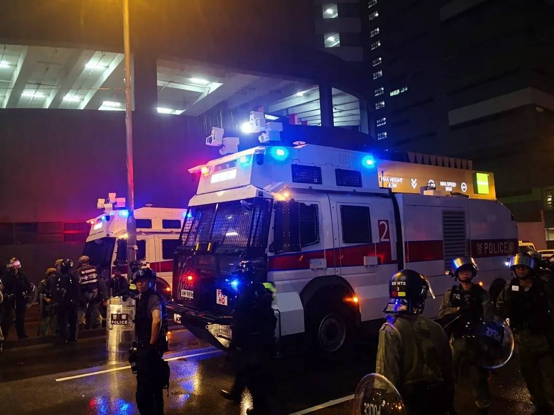 25日晚,警方水炮車行駛至荃灣楊屋道。(攝/崔萌)