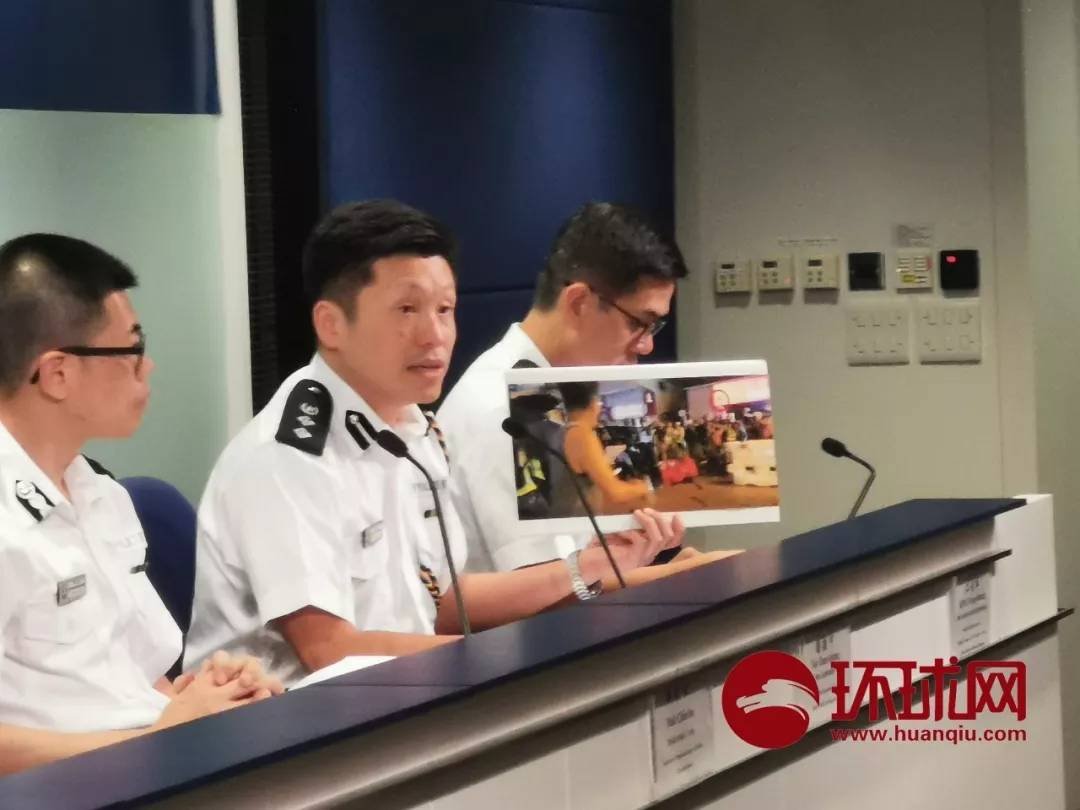 香港警隊公共關系科高級警司謝振中26日向媒體展示暴徒躲在一群記者身後扔磚塊雜物襲擊警方的照片。(楊升/攝)