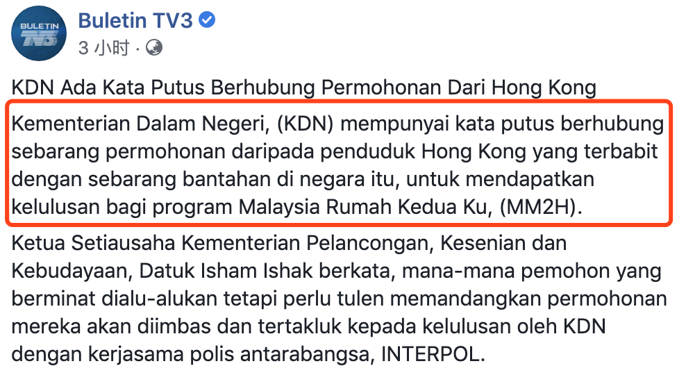 隨後他強調,馬來西亞歡迎香港居民前來申請該項目,但申請者必須“目的純粹”,“我的意思是他們不是為了逃避某些東西而來”。依斯漢透露,上周該國內閣會議已經決定,往後MM2H項目申請者的背景調查,將由該國內政部介入,同時將聯系國際刑警配合調查,防止有恐怖主義背景的人士通過該計劃進入馬來西亞。