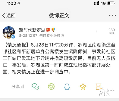 12時57分,深圳市羅湖區委宣傳部官微 @新時代新羅湖 發情況通報稱,8月28日11時20分許,羅湖區南湖街道漁邨社區和平新居單身公寓樓發生沉降傾斜,事發前社區工作站已發現地下異響並撤離疏散居民,目前無人員傷亡。事發後,羅湖區第一時間成立現場指揮部開展處置,相關情況正在進一步調查中。