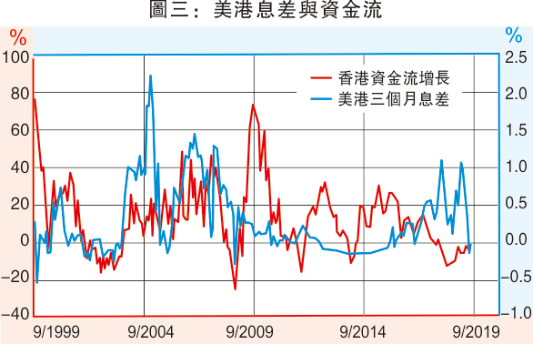 另外可看資金流。若直接看資金淨流入(即期淨外匯頭寸加貨幣基礎),如圖三顯示,其按年增長與美港三個月拆息差整體同向,不過兩者關係在金融海嘯前較為密切。然而資金流增長與股市增長有密切關係,參考本港長短息差明顯回落,經濟增長呈下行壓力,料股市增長亦然,因此推測本港資金流增長下行下,美港息差將進一步收窄。結論與圖一、二一致。