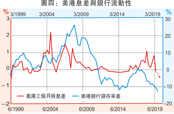 最後可看兩地銀行流動性。貸存比率反映銀行貸款對存款總額比例,按理指標愈高,銀行流動性相對愈低,再而推升拆息。圖四顯示,美港銀行貸存比率差與美港三個月息差同向,前者更領先後者三個月。美國銀行貸存比率近月開始比本地銀行低,可見其流動性壓力比本地銀行較小,因此兩者息差進一步收窄。按圖中紅箭顯示,同樣預示美元與港元三個月息差在未來一季進一步收窄。