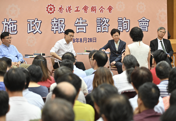 工聯會歡迎林鄭到勞工基層聽意見,期望有關部門加強與行業工會的溝通。林鄭一一細聽,並表示政府會盡力整合各方面的意見,制訂更多有利民生的措施,同時研究作出短期紓解舉措,以解燃眉之急。諮詢會約長2小時,在完會前特首與在場人士合唱《獅子山下》,共同期盼紛爭與亂局盡早結束,香港恢復秩序,回復安寧,東方之珠再次在世界發亮!