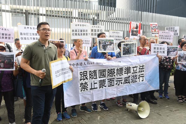 「政中香港人」及禁蒙面法關注組一行多人,昨早上到政府總部門外請願,他們手持「蒙面罪犯,逃避刑責,不利緝捕」、「表達正當訴求,何需鬼祟蒙面」等標語,並高喊「國際標準,香港為何獨缺」等口號。「政中香港人」發言人林偉康說,兩個多月來,蒙面黑衣人在全港多區肆意破壞公共設施、商店。他們蒙面隱藏身份,增加警方執法及檢控難度,藉此逃避法律責任和後果。