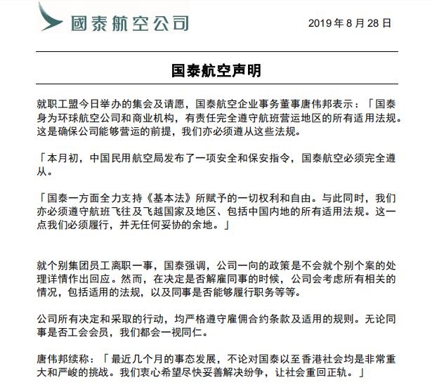 就個別集團員工離職一事,國泰強調,公司一向的政策是不會就個別個案的處理詳情作出回應。然而,在決定是否解雇同事的時候,公司會考慮所有相關的情況,包括適用的法規,以及同事是否能夠履行職務等等。