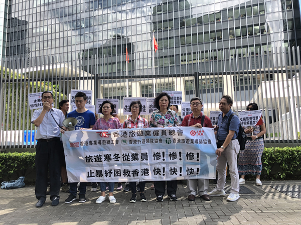 工聯會指,6月初起的一連串示威活動和不斷的極端暴力行為,對香港的形象和聲譽產生極負面影響,影響旅客訪港意欲,訪港人數持續下跌,令稍有起色的旅遊業受到重挫,內地,東南亞,歐美旅客及旅行團持續下跌,近月更急速下跌,有8成導遊無工開,有工開收入也大減7成,從業員已手停口停,生活陷入团困境。