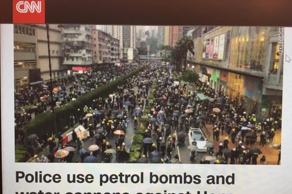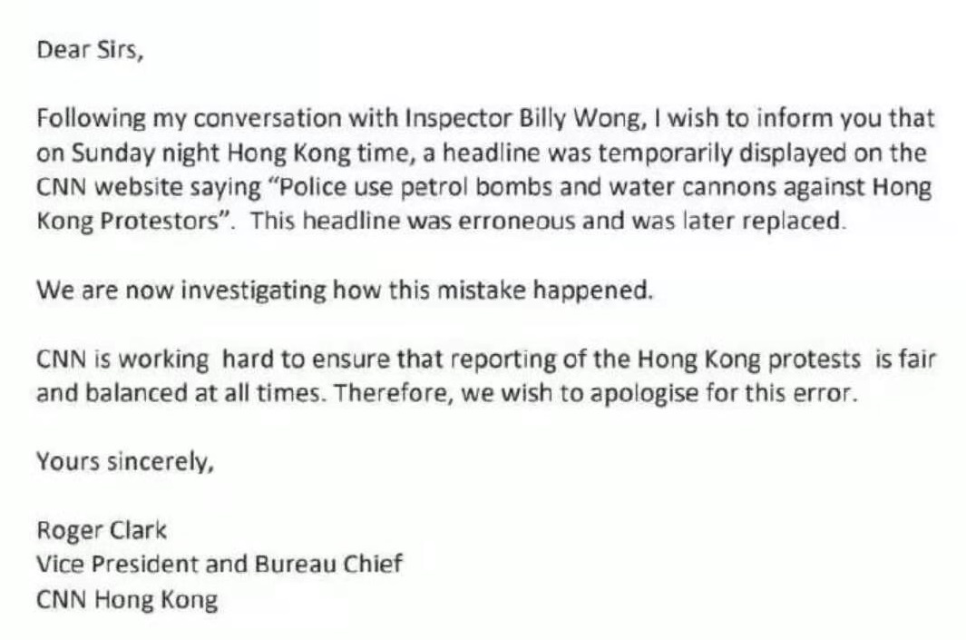 CNN的道歉信指,就上周日晚在CNN的新聞平台上出現一條題為「警察用汽油彈及水炮車對付香港示威者」的新聞,有關報道不實。CNN已就此進行調查,希望查出發生此錯誤的原因。