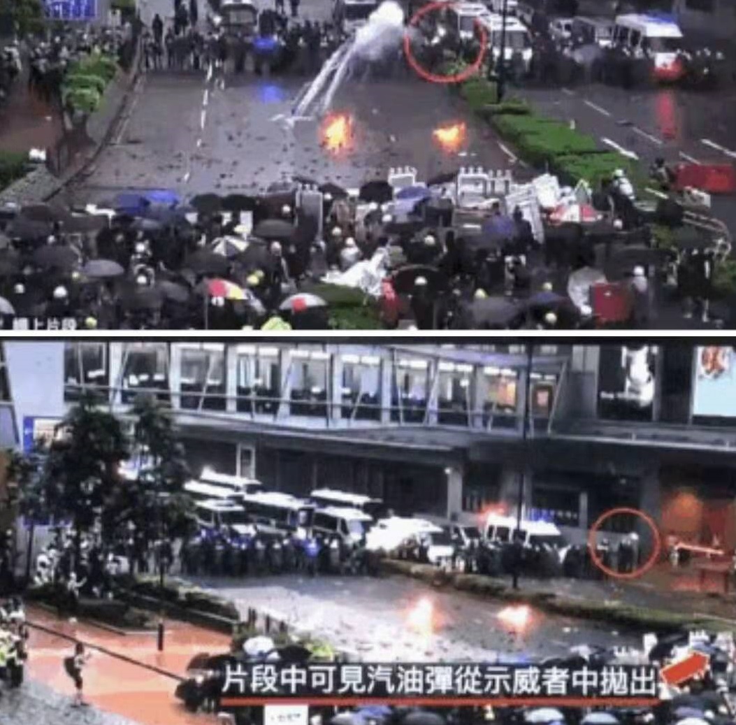 上為惡意刪改視頻,下為示威者擲出汽油彈位置(紅圈)。圖:互聯網