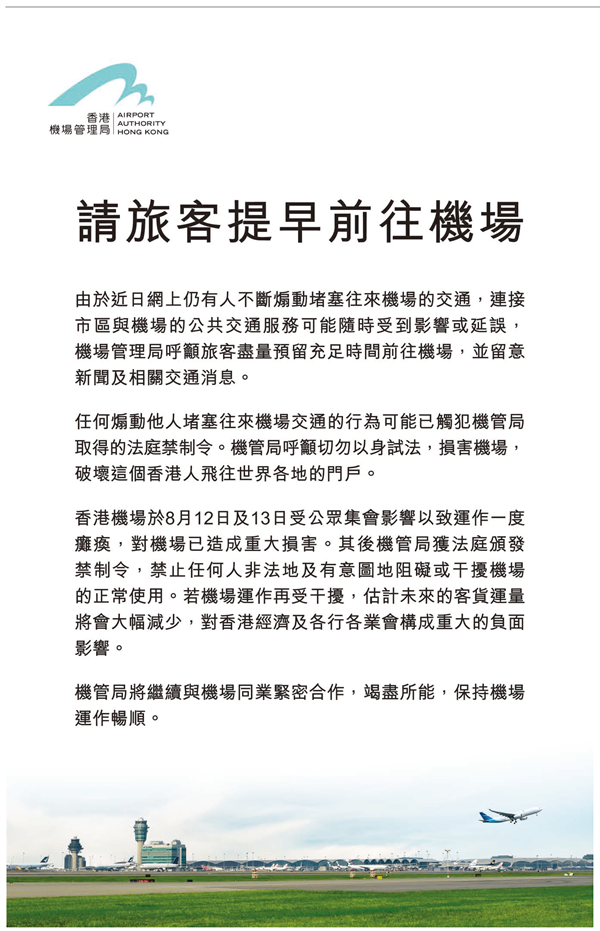 廣告中還提到,機場於8月12日及13日受公眾集會影響以致運作一度癱瘓,對機場已造成重大損害。其後機管局獲法庭頒發禁制令,禁止任何人非法地及有意圖地阻礙或干擾機場的正常使用。