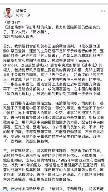 【香港商報网訊】據中通社報道,全國政協副主席、香港特區前行政長官梁振英(CY)於30日在社交媒體發表對香港時局看法,指「黑衣暴力運動」早已變質,運動的主角已經不是和平示威遊行的市民,運動的目標也已經不是「五大訴求」,而是以暴力和其他非法手段癱瘓社會和推翻特區政府,奪取香港政權。以下為全文: