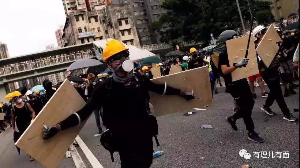 手持攻击性武器、盾牌全副武装的“勇武组织”暴徒