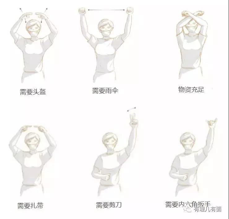 经对游行队伍观察,很容易发现黑衣人有一套专门的手语体系,可以在人群中快速传播消息。如:双手放在头部附近上下挥动,就是雨伞;单手举起“V”字手势,需要剪刀;高举双手,两只食指成一直线,需要扎带;单手上举做出“六”字手势,则需要内六角扳手;双手在额头上交叉,则表示物资充足。