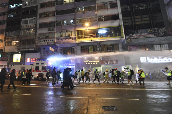 暴徒向警狂掟汽油彈 水炮車首射藍水顯威力