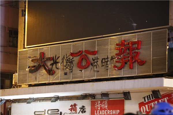 大公報的招牌被示威者破壞。大公文匯傳媒集團昨晚發表聲明,強烈譴責港島暴亂中,暴徒於灣仔惡意破壞、塗污大公報招牌的行為,要求警方依法追究並嚴懲兇手。聲明並表示決不向黑惡勢力低頭。