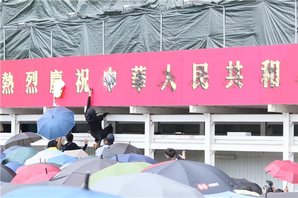 在昨午的宗教集會及遊行期間,大批示威者下午3時許向上環方向進發,在途經中環正在重建的和記大廈外牆,見地盤展示「熱烈慶祝中華人民共和國成立七十周年」橫額,有部分身穿黑衫及戴上面罩的示威者,竟用黑漆塗污並撕毀;行動時外圍有黑衣人拿起雨傘遮擋作掩護。