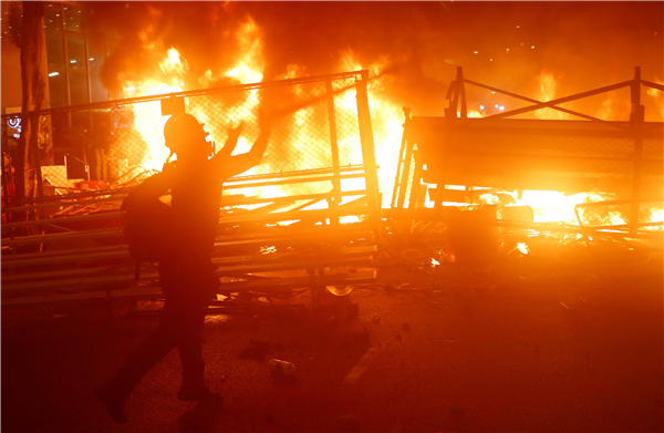 【香港商報网訊】記者周偉立、戴合聲報道:有網民昨午在灣仔修頓球場發起以宗教為名的集會活動,藉此豁免向警方申請。但集會者之後走出主要幹路,令灣仔及中區多條幹道被人潮堵塞。由於警方在西區中聯辦一帶作出嚴密布防,示威者不敢造次,大批黑衣人分頭四處流竄,回頭向金鐘的政總外聚集。期間向以被水馬圍住的政府總部及立法會大樓擲石,投擲燃燒彈。警方數度施放催淚彈及胡椒噴霧,並出動水炮車向人群發射藍色水柱驅散,防暴警察在6時後已順利清場。之後大批暴徒分別乘地鐵及步行至警察總部附近軒尼詩道,趁入夜用大量物件設置路障,並公然淋電油縱火,一大段路面火光熊熊,相信是近月內暴徒在馬路放起的最大一場火。現場更數度傳出爆炸聲,火勢持續超過半小時,濃煙直捲上天。
