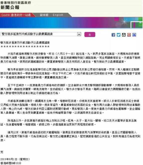 發言人表示,激進示威者的違法及暴力行為持續升級,罔顧市民大眾的安全,特區政府予以嚴厲譴責,警方亦必定嚴正追究。特區政府將繼續維護法治,並且再次呼籲廣大市民一同向暴力說「不」,讓社會盡快恢復秩序。