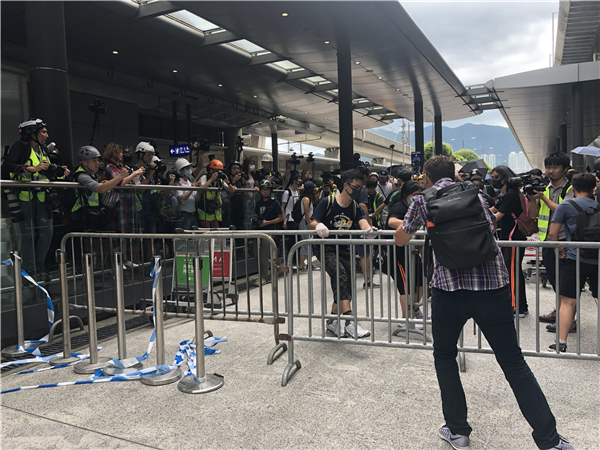 有一條綠色的鐵支被放在機鐵路軌上,致一列機鐵列車需停在前方,未能駛離。現場亦有示威者將磚頭等雜物扔入路軌範圍。