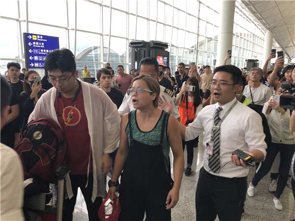 【15:30】一批穿黑衣人士在離境層包圍並辱罵一名女性旅客(綠衣者),並對其大罵「大陸哩,返大陸」,該名旅客以廣東話回應稱,自己是要去澳洲,不知為何被指罵。其後她在機場職員及友人陪同下離開。